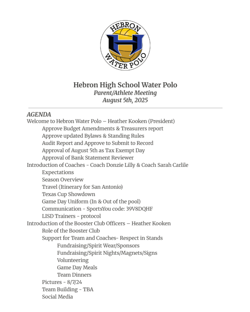 | President President Elect Vice President Treasurer Secretary Parliamentarian Committee Chairs Communications / Social Media Volunteer Coordinator Concessions Chair Hospitality Scholarship | Heather Kooken Leslie Moncrief Damon Wehr Vanessa Hermo Daniela Slavu Will be appointed Heather Kooken Tricia Johnson Chi Trieu Evie Mandrell |
